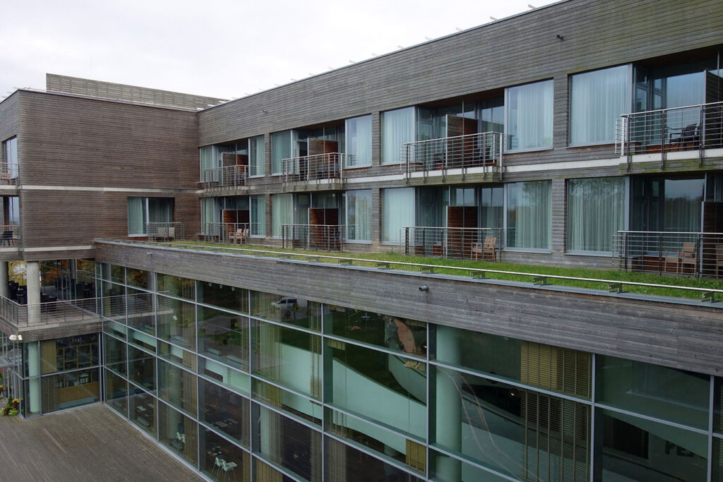 Marriott занимает четырехэтажное здание, облицованное деревом.