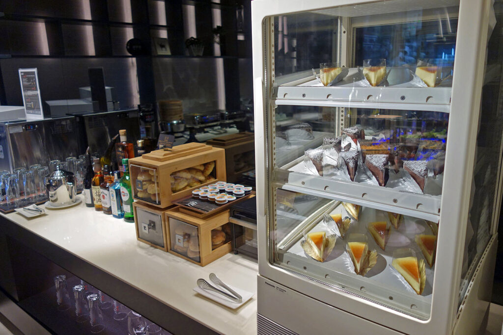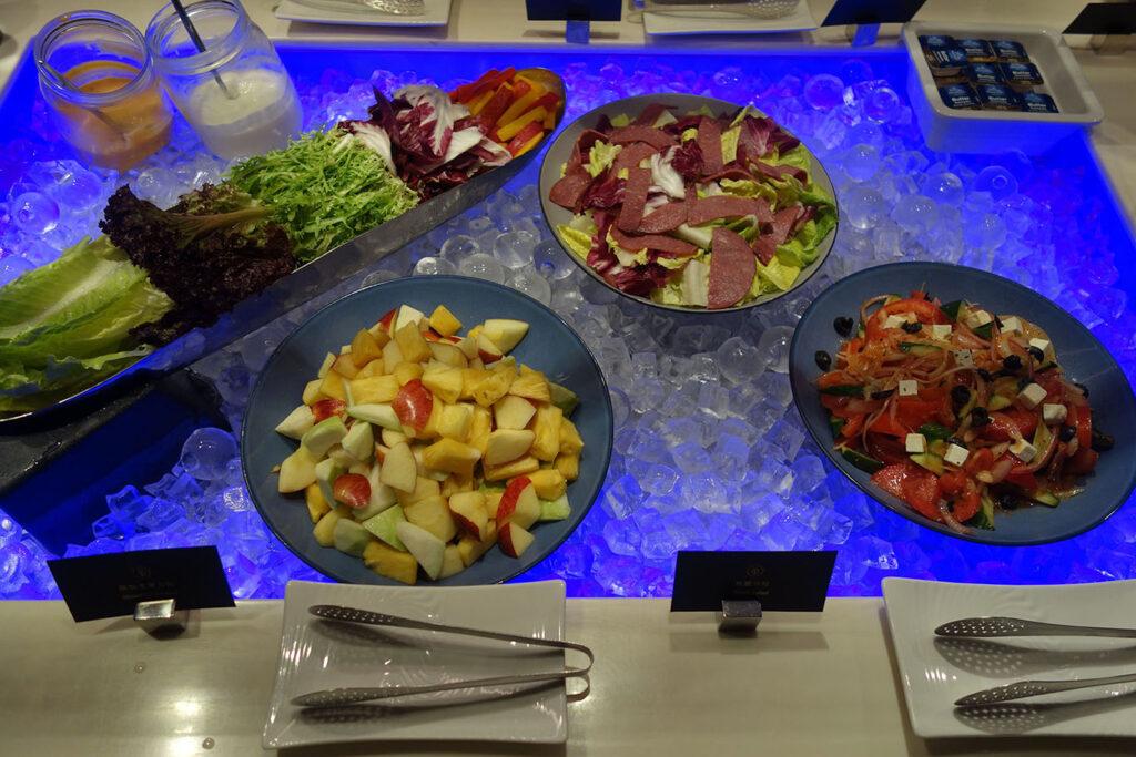Я навестил лаунж сразу при его открытии, в 5 часов утра. Ассортимент жратвы в буфете в большей степени соответствовал обеденному: были несколько готовых салатов, свинина в соусе, дим сумы, овощи, картошка фри, и несколько видов тортиков.