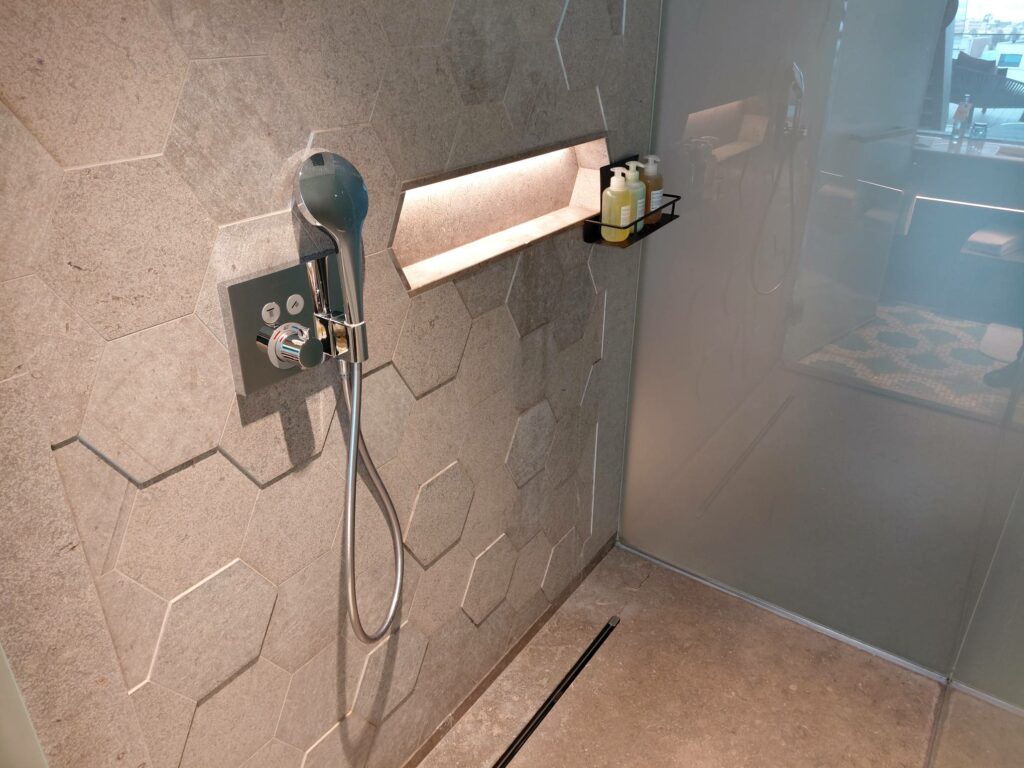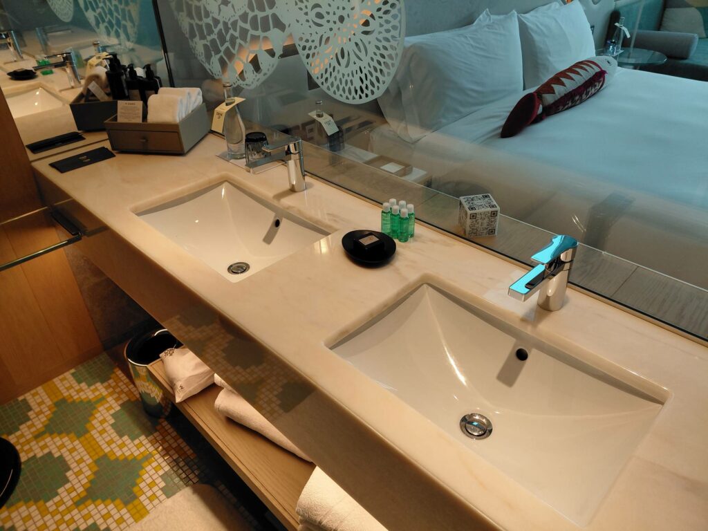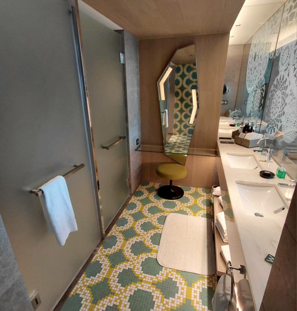Ванная комната оказалась самой приятной частью сьюта: не только действительно функционально и приятно глазу, но и стеклянный макияжный столик хоть в какой-то степени пригоден для работы за ноутбуком.