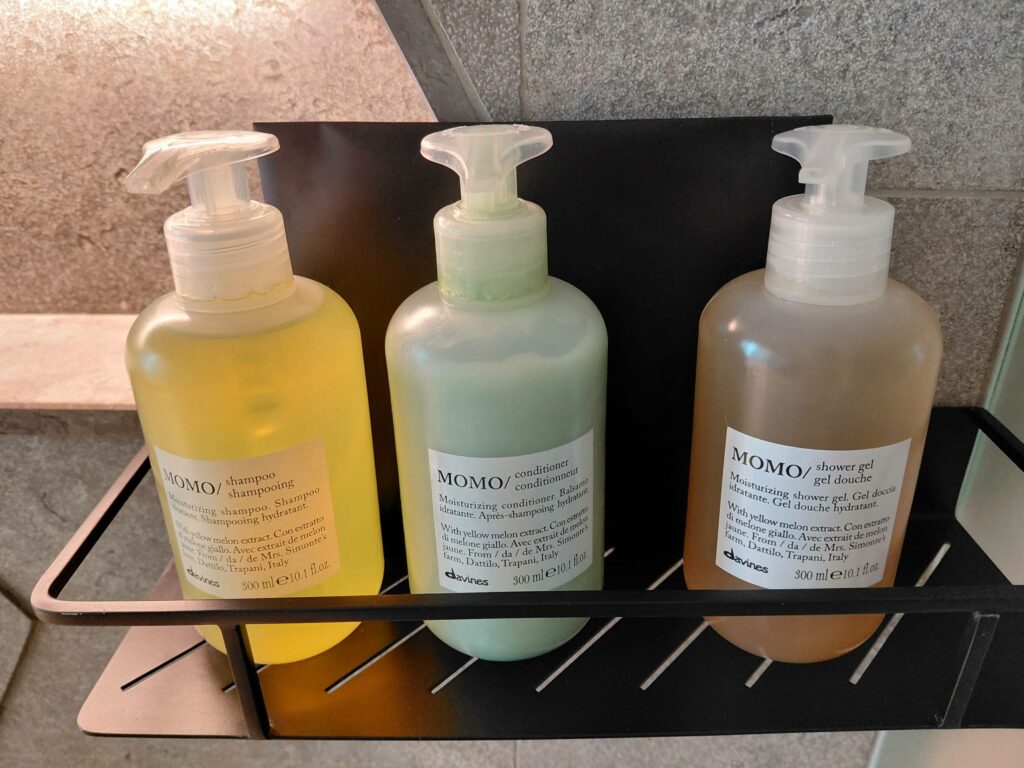 Банные жидкости были от бренда Momo. Набор аксессуаров был полноценным, включая губку и шесть ополаскивателей для рта (которые я предварительно запросил в мобильном приложении).