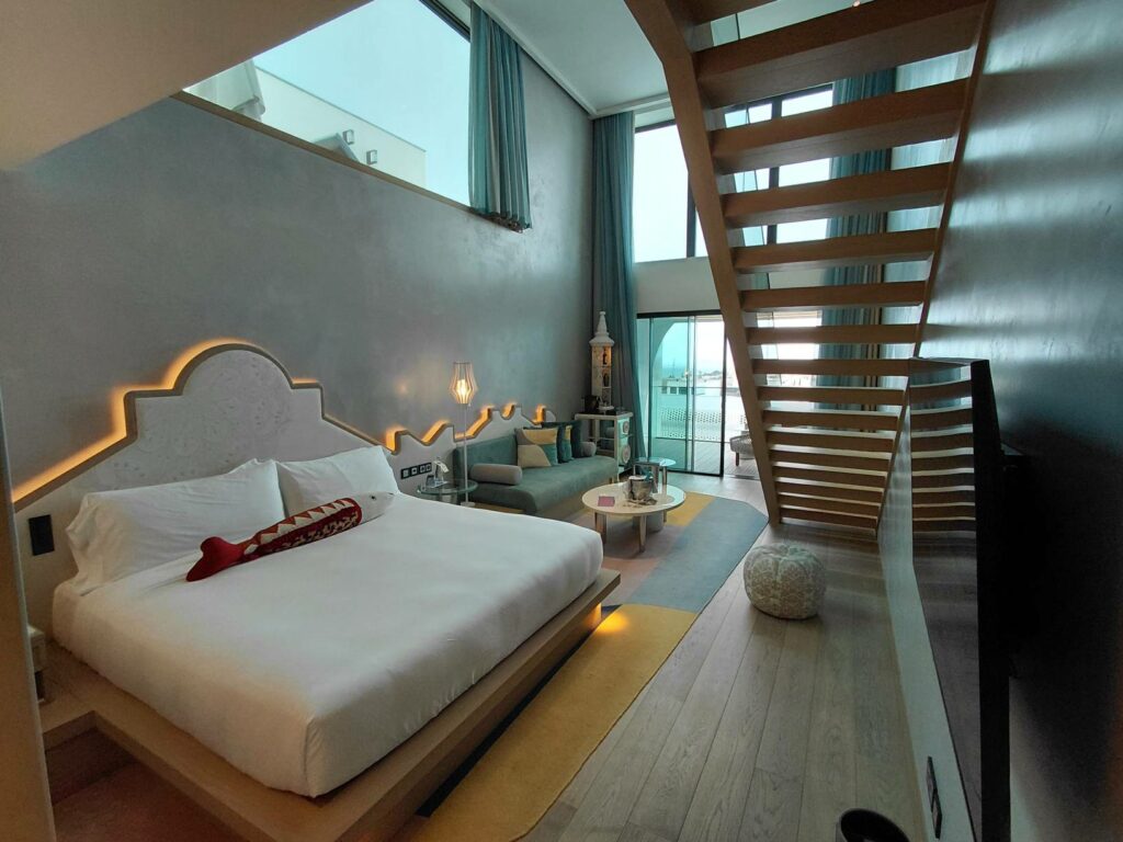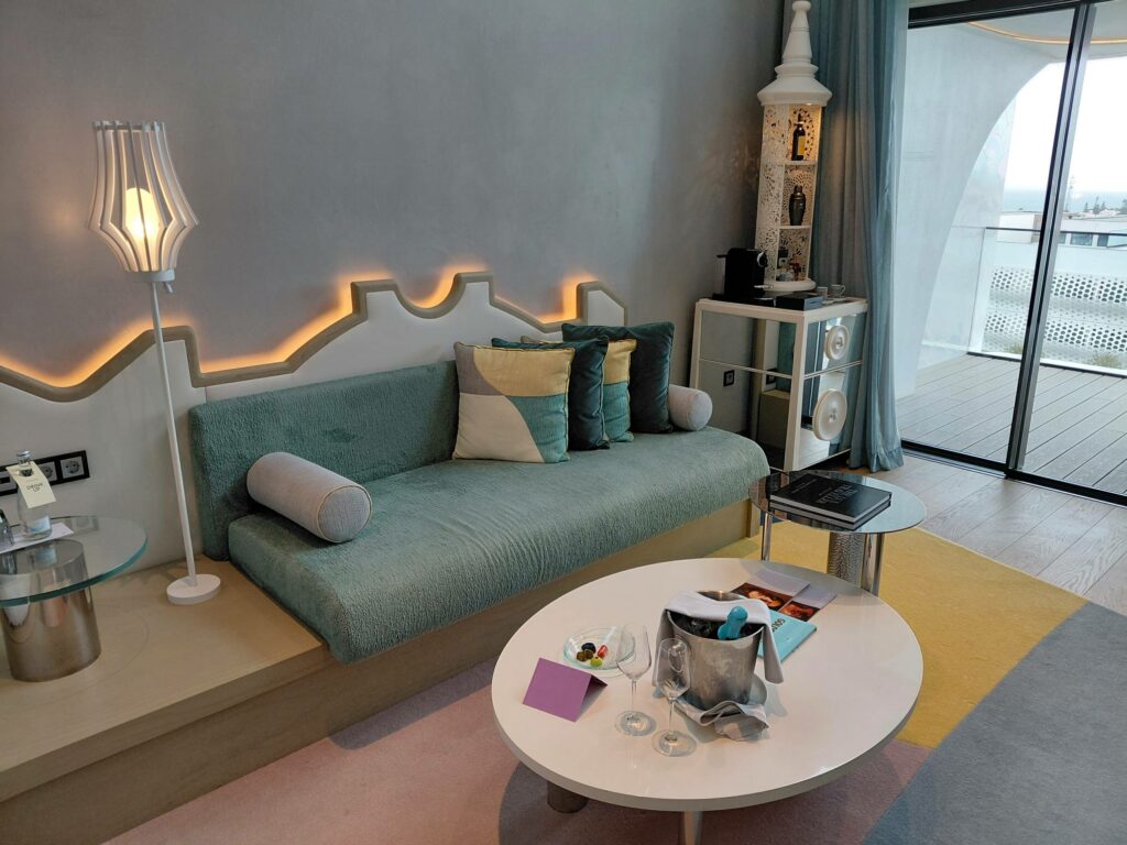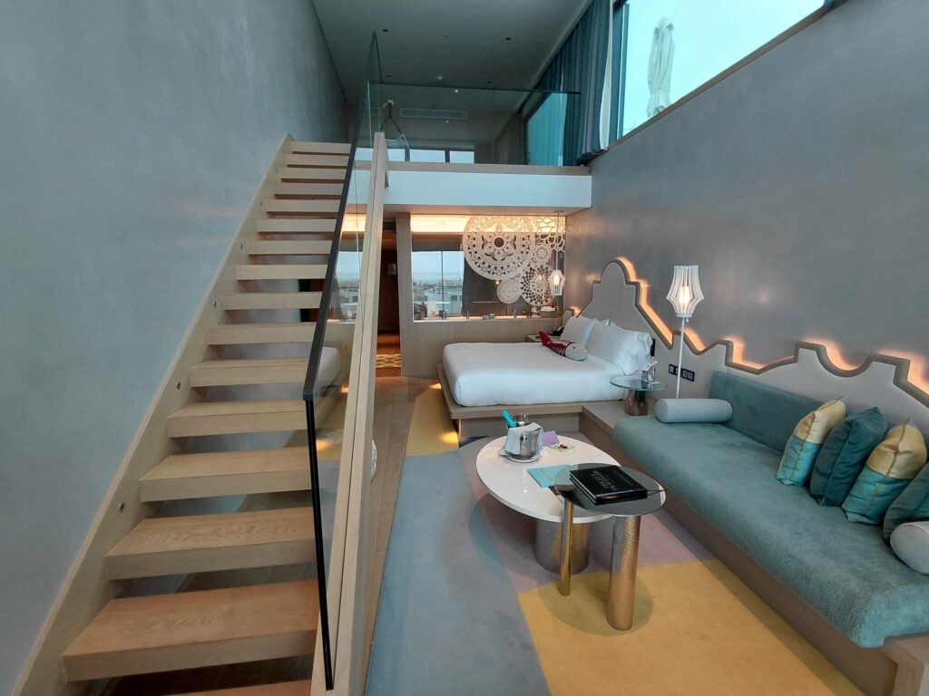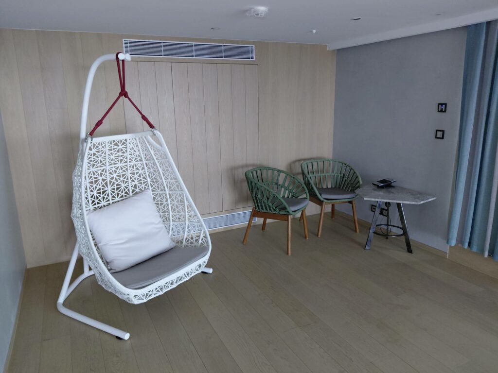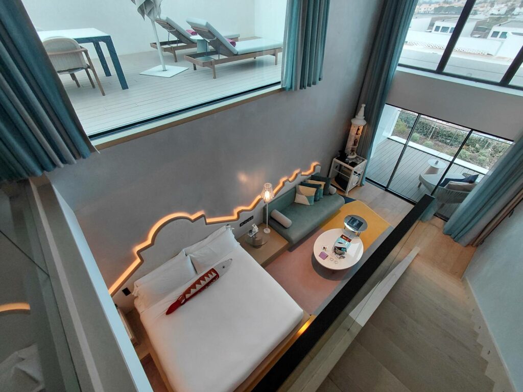 Что ж, WOW Suite – безусловно инстаграммабельное жилище. У создателей получился симпатичный дизайн с отсылками к культуре Алгарве. Но не слишком комфортное и практичное. Я не понимаю, зачем нужен второй этаж: качаться на качалке в пустом помещении? лежать на лежаке с видом в стену? И я не понимаю, почему на большой площади не нашлось место хоть какому-то столу, пусть и не офисному. (Более того, мне подтвердили, что рабочих столов нет ни в одной категории номеров.)