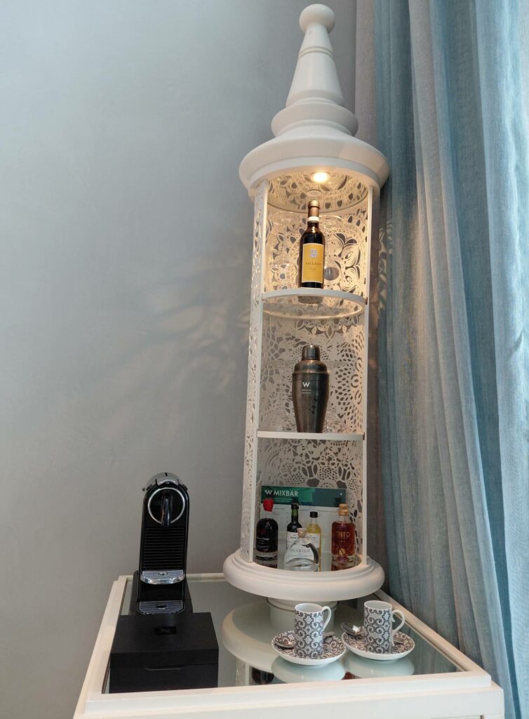 В углу, возле окна, был эффектный минибар, который – по традиции W – включал крепкий алкоголь и шейкер для приготовления коктейлей. И гляньте на очаровательные кофейные чашки.