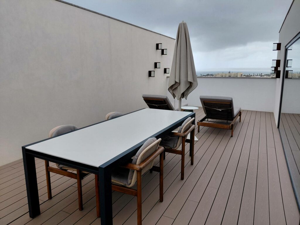 Терраса включала обеденный стол и два лежака.