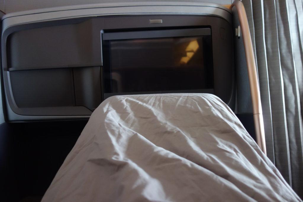 На следующей фотографии я лежу на разложенной кровати. Нет, это не мое возбуждение от бизнес-класса Singapore Airlines 😉 Чтобы уместиться по длине, мне пришлось до такой степени поднять колени.