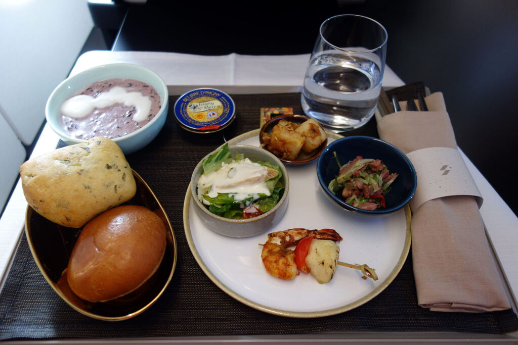 Что касается кейтеринга, то я могу поставить твердую пятёрку ассортименту и вариативности. На обоих рейсах (да-да, даже на совсем коротеньком из HKG в TPE) было полноценное меню с двумя жральными концепциями: фиксированное меню от шефа, плюс стандартное меню с двумя вариантами горячих блюд. Вау!