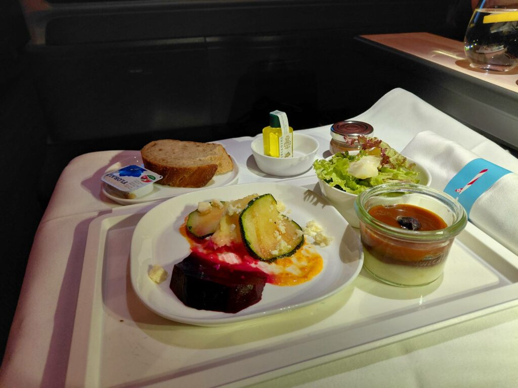 Можете сами судить, насколько картофельное месиво (на полпути от варёной картошки к пюре) с одним куском вареной свеклы и двумя кружочками цуккини соответствует стандартам премиум-класса. Окей, я быстренько сожрал месиво, и стал ждать основного гастро-перформанса. Тем более, недавно Edelweiss анонсировала обновленное меню с акцентом на швейцарскую кулинарию,
