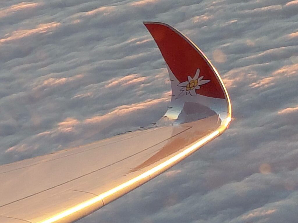 Курортные авиакомпании часто имеют более расслабленный, дружелюбный персонал. Мой рейс подтвердил это: обслуживающий мой ряд мужичок оказался словоохотливым и улыбчивым. Он заинтересовался моим фотографированием; узнав, что я неравнодушен к самолётикам, он выдал мне информацию про реконфигурацию самолётов Edelweiss. Дескать, недолго осталось летать на такой “рухляди”.